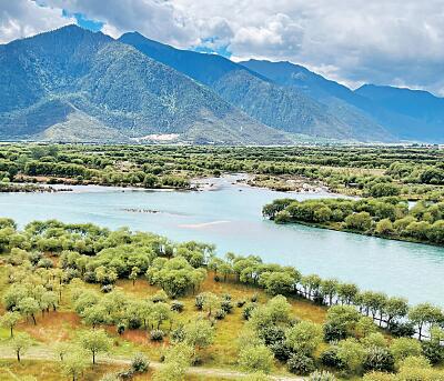 雅魯藏布江與尼洋河的交匯處,碧波蕩漾,草木蔥蘢,沙洲綠樹蓬勃盎然。