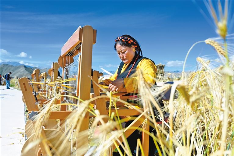 萬里晴空下,金色青稞隨風搖曳,靜等豐收的季節(jié);希望的田地上,在傳承和創(chuàng)新中,千年氆氌再現(xiàn)輝煌。