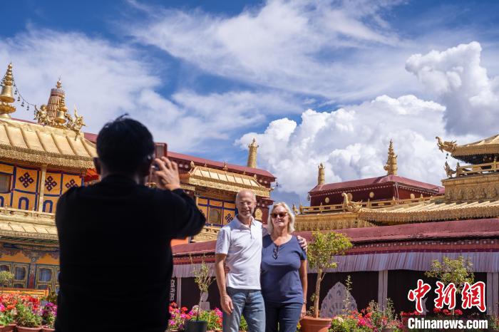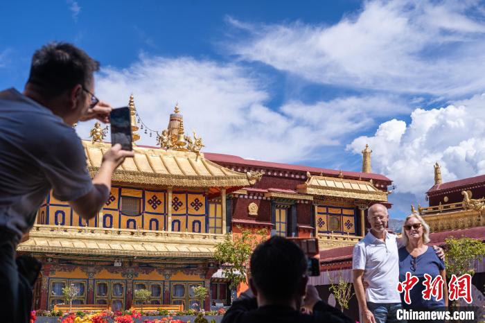 9月17日,外國(guó)游客在西藏拉薩大昭寺合影留念。中秋佳節(jié),距今已有1300多年歷史、2000年作為布達(dá)拉宮擴(kuò)展項(xiàng)目列入《世界遺產(chǎn)名錄》的拉薩大昭寺迎來(lái)眾多游客。中新社記者 貢嘎來(lái)松 攝