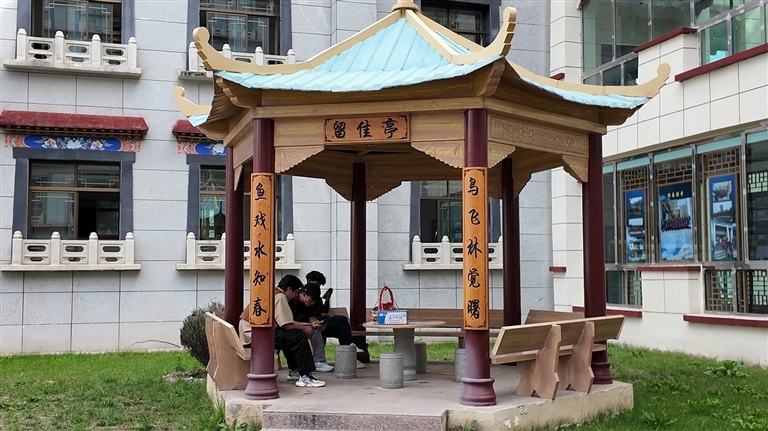 學生正在校園內(nèi)的涼亭里讀書。