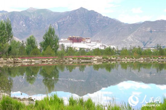 雄偉的布達拉宮與綠意蔥蘢的南山隔河相望。人民網(wǎng)記者 劉凡攝