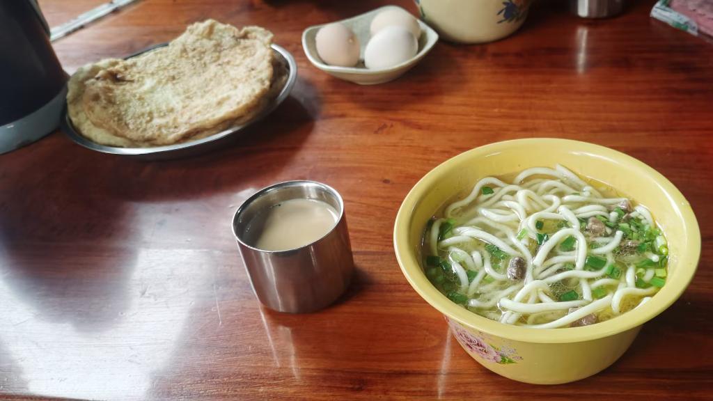 藏面的經(jīng)典套餐中還包括牛肉油餅、雞蛋和甜茶。新華社記者魏冠宇 攝