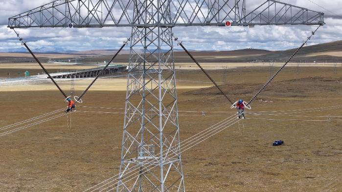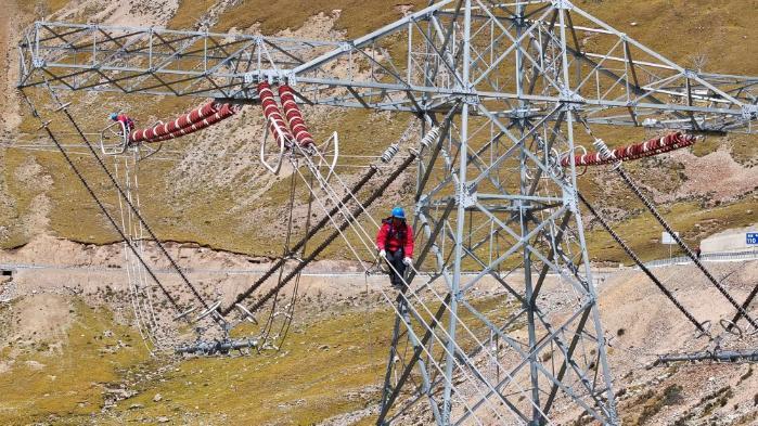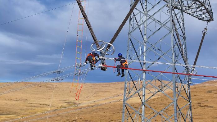 于是在接下來(lái)的幾天,記者跟隨著青藏聯(lián)網(wǎng)工程線(xiàn)路年檢工作人員沿著檢修輸電線(xiàn)路從拉薩市林周縣出發(fā)到那曲市安多縣境內(nèi),在此期間,記者經(jīng)歷了一年四季的天氣變化。9月20日,在青藏聯(lián)網(wǎng)工程西藏側(cè)林周段年檢現(xiàn)場(chǎng)2329號(hào)塔位,2名檢修人員正在40多米的高空檢查絕緣子、金具、導(dǎo)地線(xiàn)、引流板和間隔棒。與此同時(shí),“電力天路”上還有15名國(guó)網(wǎng)西藏電力輸電線(xiàn)路檢修人員同步穿梭在鐵塔與銀線(xiàn)之間,開(kāi)展年度檢修作業(yè)。