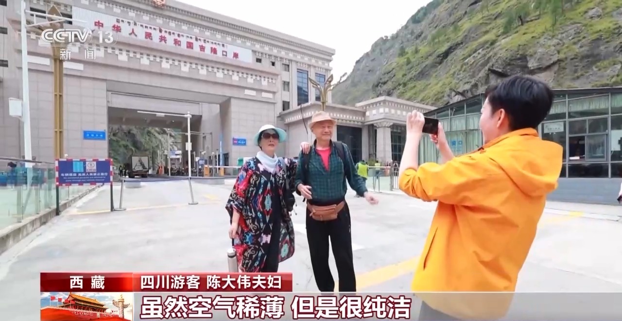 四川游客 陳大偉夫婦:雖然空氣稀薄,但是很純潔,它滌蕩了我的心靈,這是祖國的大好河山,我們一路上是唱著歌來的,看到國門激動,這就是我們的感受。沒有新中國就沒有今天,趕上這么好的時光,心有所向。