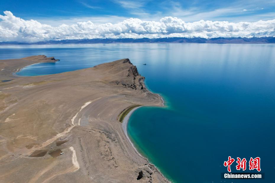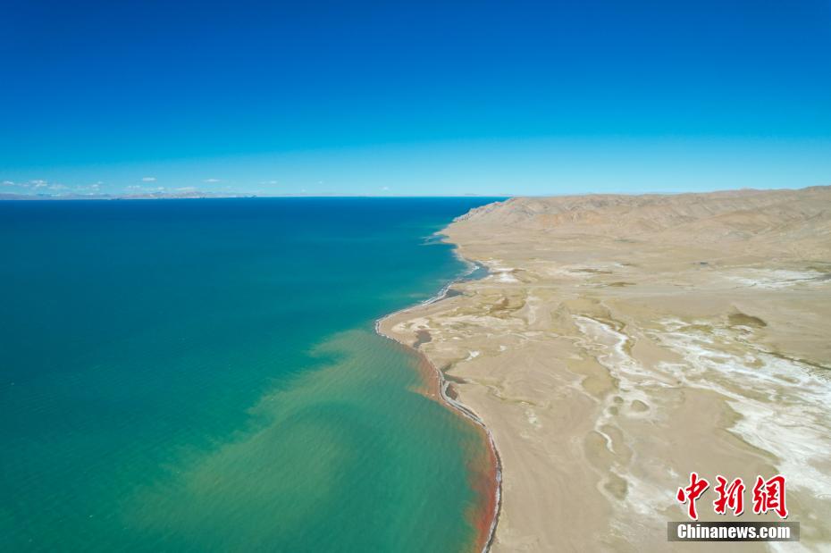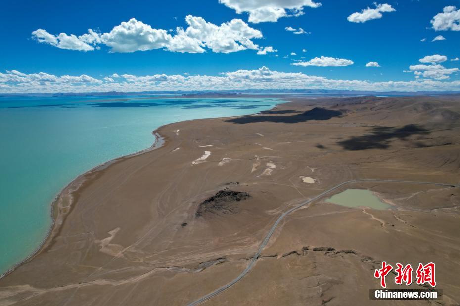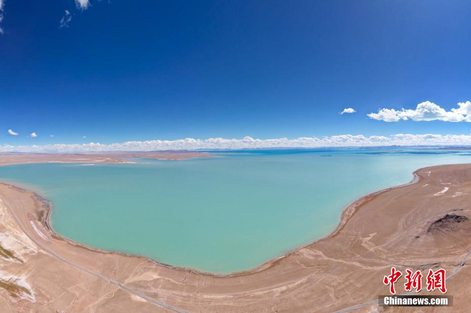 國慶期間,中新網(wǎng)記者自駕西藏藏北羌塘草原,途經(jīng)“天湖”納木錯(cuò),高原鹽湖班戈湖以及西藏第一大湖色林錯(cuò)等地。秋天高原藍(lán)天白云的映襯下,藏北湖泊猶如一面面巨大的“寶石藍(lán)”鏡子鑲嵌于高原大地,景色壯麗。圖為10月2日,航拍西藏第一大湖色林錯(cuò)北岸風(fēng)光。記者 江飛波 攝