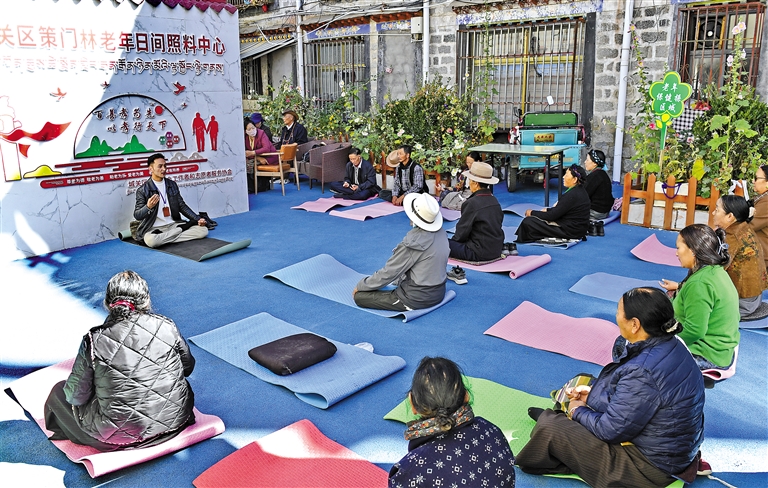 圖為拉薩市城關(guān)區(qū)策門林老年日間照料中心舉辦培訓(xùn),教老人們練習(xí)瑜伽。記者 旦增蘭澤 攝