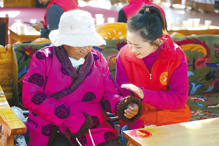 圖為那曲市索縣新時(shí)代文明實(shí)踐中心為特困人員集中供養(yǎng)服務(wù)中心的老人送去關(guān)心和關(guān)愛(ài)。記者 曲珍 通訊員 王霖 攝