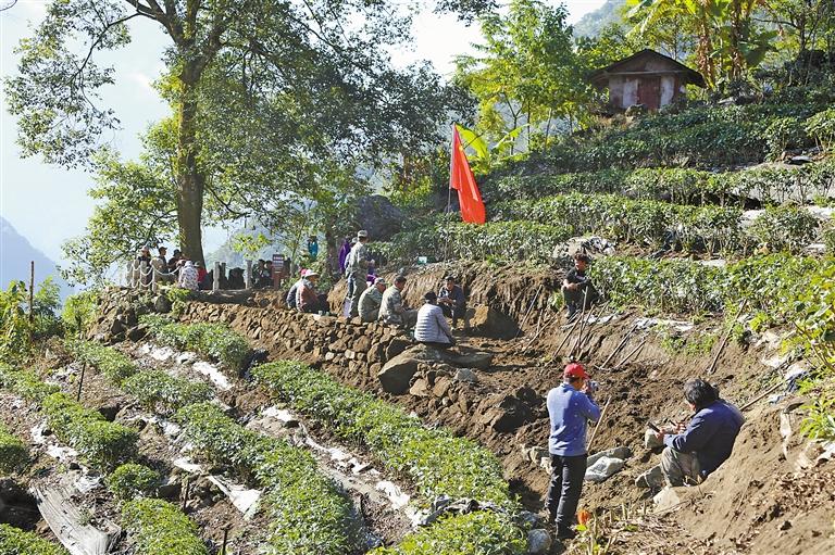 墨脫縣德興村茶果園內(nèi),工作人員正在護(hù)理樹(shù)苗。 記者王珊 謝筱純 攝
