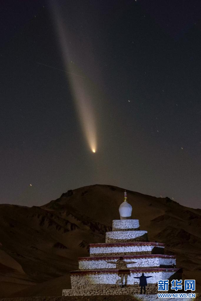 10月13日,在西藏阿里地區(qū)獅泉河鎮(zhèn)熱拉紅堡白塔拍攝的彗星。新華網(wǎng)發(fā) 曹枝清攝