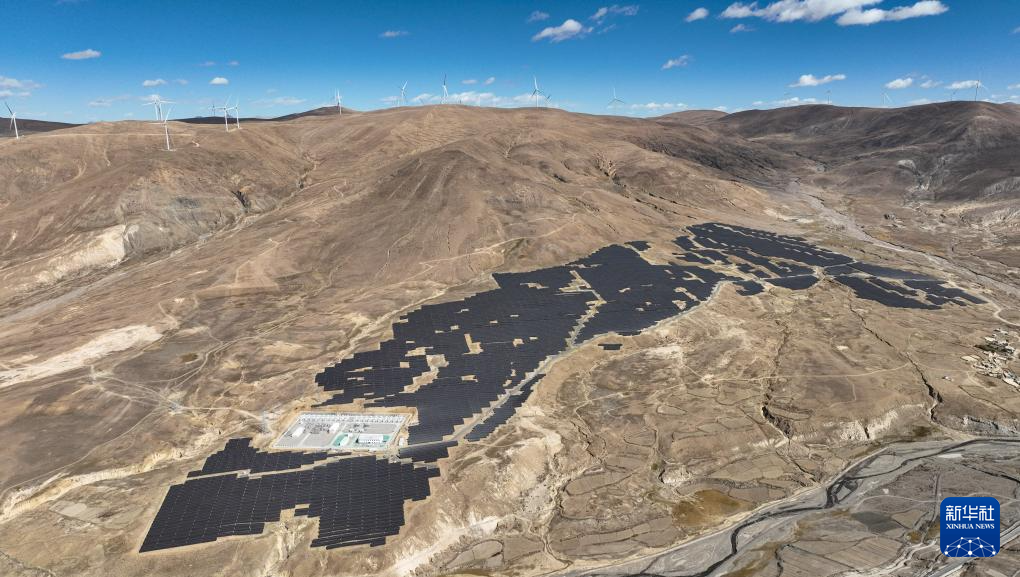10月17日拍攝的位于西藏日喀則市薩迦縣的中核薩迦300兆瓦風(fēng)光儲一體化電站(無人機照片)。新華社記者 晉美多吉 攝