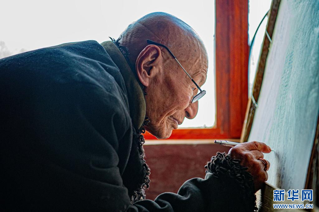 10月17日,今年92歲的昌都嘎瑪嘎赤畫派國(guó)家級(jí)非遺傳承人嘎瑪?shù)吕赵诩耶嬏瓶?。新華網(wǎng) 旦增努布 攝