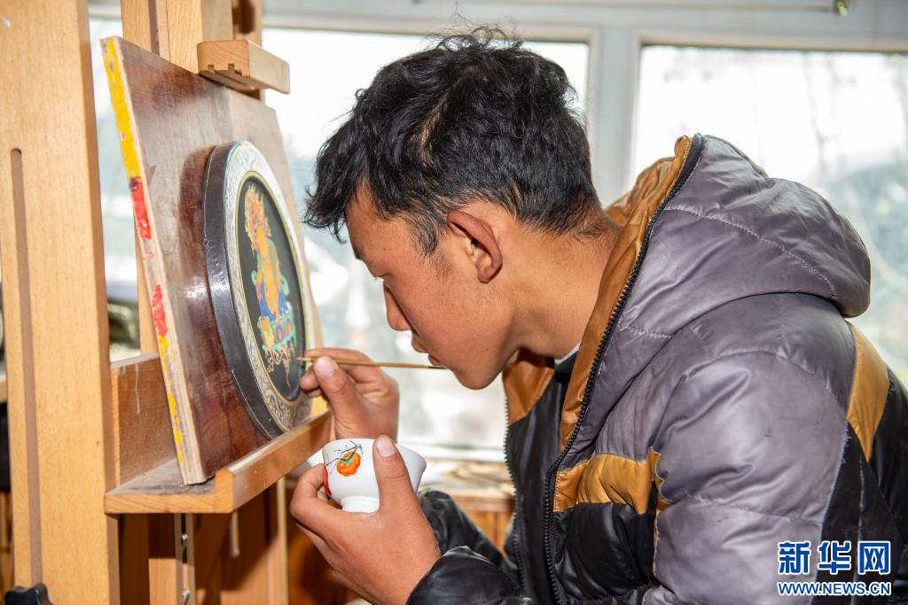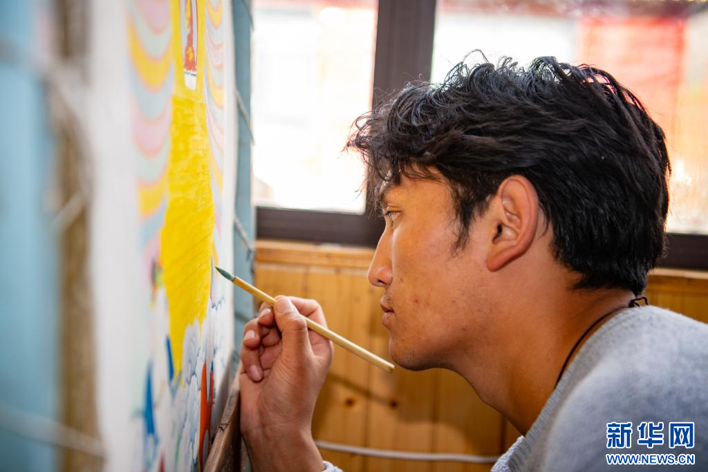 10月17日,卡若區(qū)嘎瑪鄉(xiāng)比如村的畫師在繪制唐卡文創(chuàng)產(chǎn)品。新華網(wǎng) 旦增努布 攝
