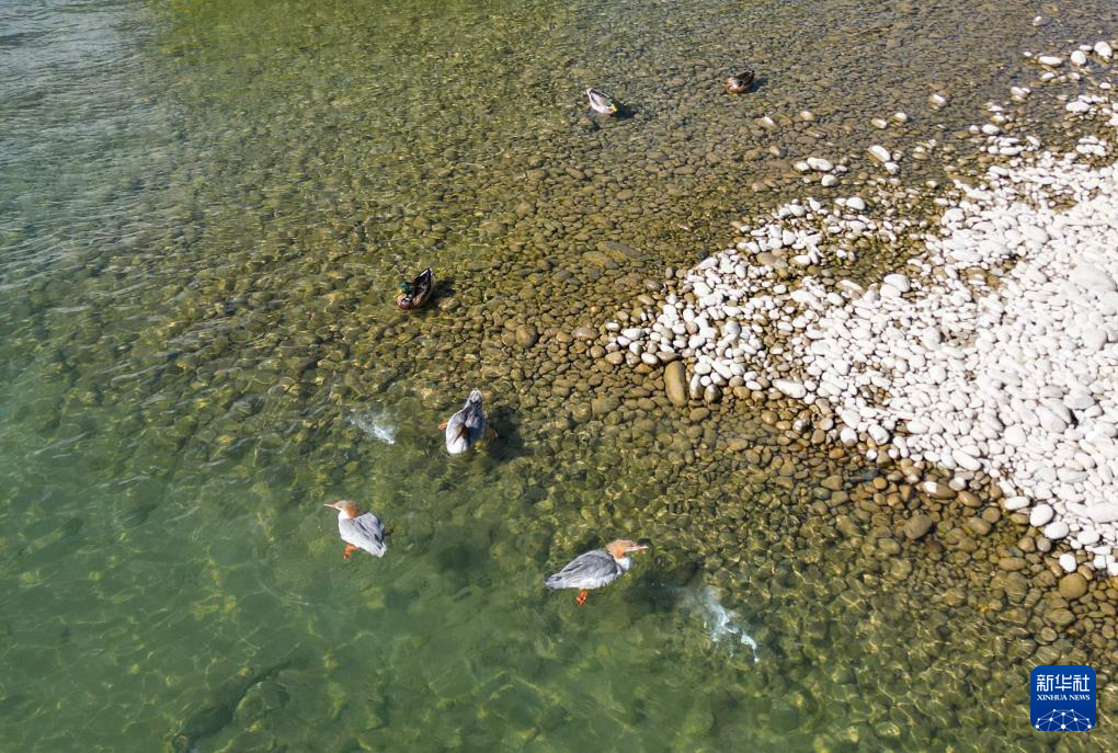 在林芝雅尼國家濕地公園內(nèi),不同種類的野生鳥類棲息在尼洋河畔(10月24日攝,無人機(jī)照片)。新華社記者 劉天宇 攝