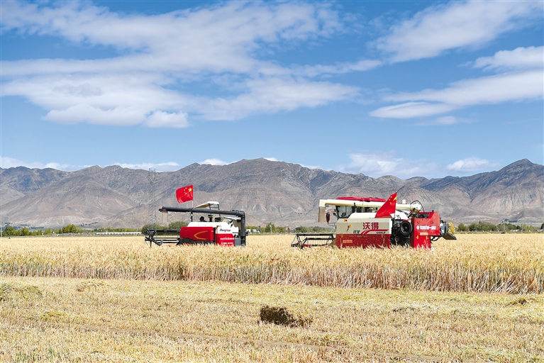 配圖:日喀則市白朗縣巴扎鄉(xiāng)農(nóng)機(jī)合作社的村民進(jìn)行機(jī)械化收割。(資料圖片)記者 李洲 攝