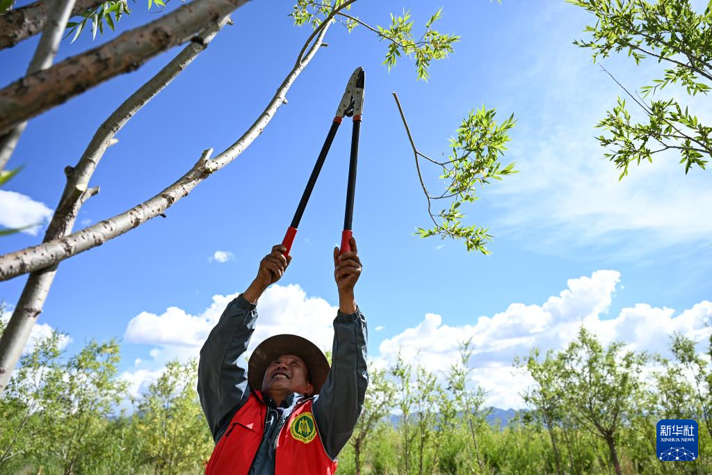在雅江北岸南木林生態(tài)示范區(qū),當(dāng)?shù)刈o林員在修剪林木(2024年9月1日攝)。新華社記者 孫瑞博 攝