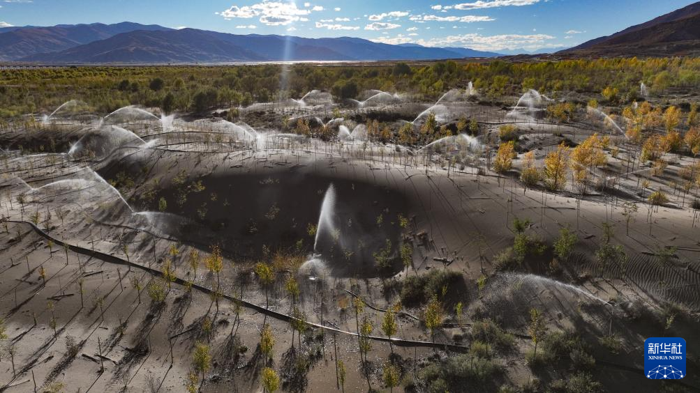 在雅魯藏布江畔,自動灌溉設(shè)備給樹木澆水(2024年10月24日攝,無人機照片)。新華社記者 晉美多吉 攝