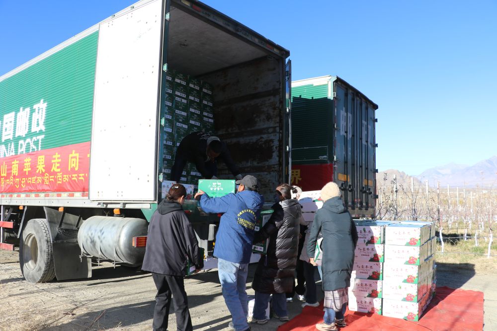 山南市扎囊縣矮化蘋果種植基地工作人員正在裝車。(山南市委宣傳部供圖)