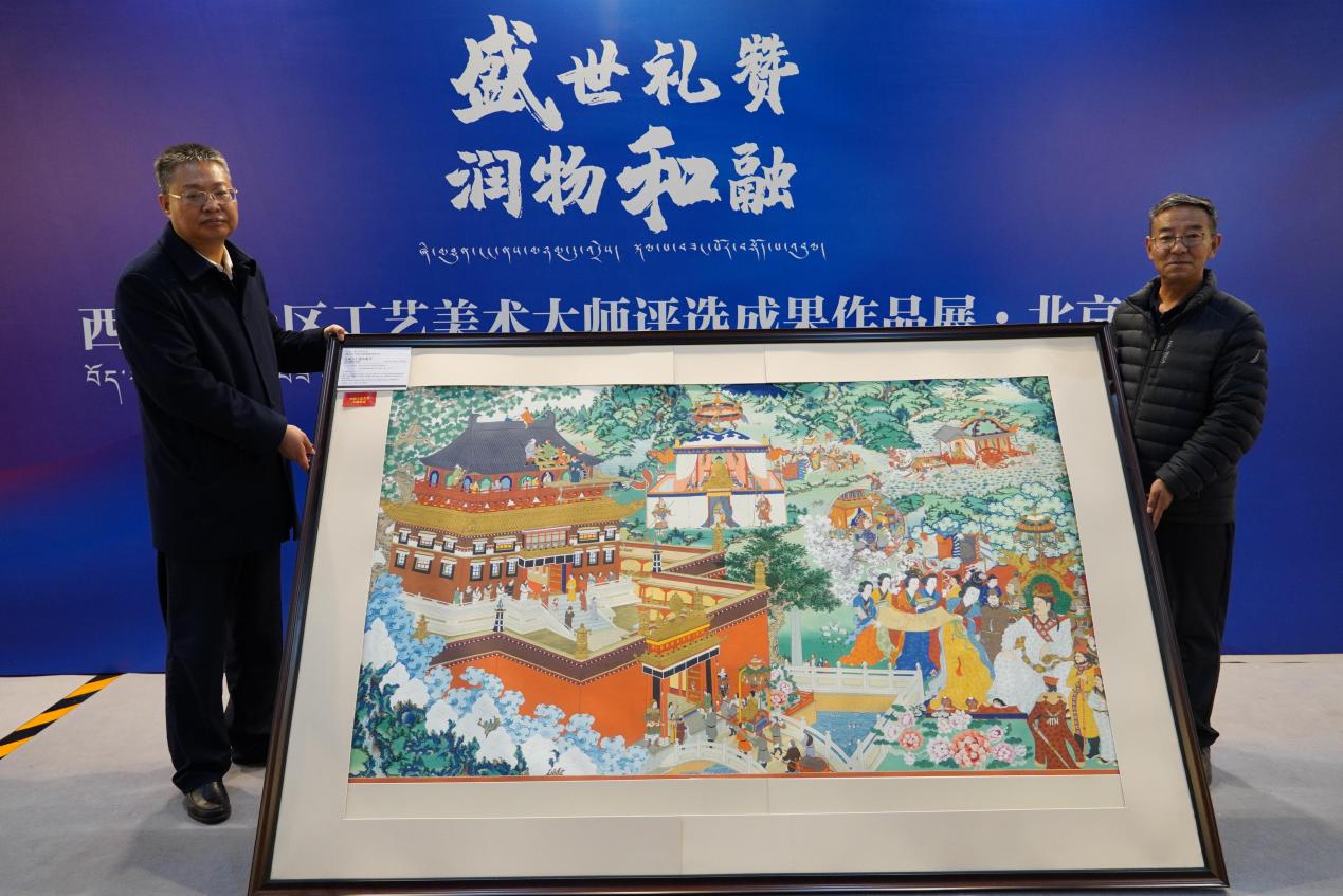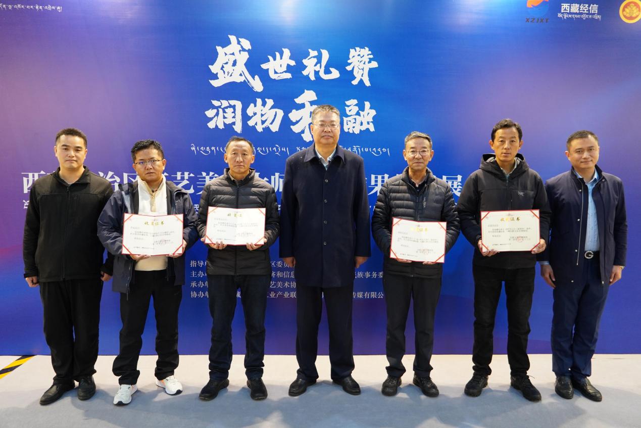“西藏自治區(qū)工藝美術(shù)大師評(píng)選成果作品展”由西藏自治區(qū)經(jīng)濟(jì)和信息化廳、西藏自治區(qū)民族事務(wù)委員會(huì)聯(lián)合主辦,于2024年11月7日在民族文化宮展出。本次捐贈(zèng)作品為“西藏自治區(qū)工藝美術(shù)大師評(píng)選成果作品展”中的5件代表性精品力作,包括唐卡作品《格薩爾王》(復(fù)制件)(作者:貢覺(jué)杰)、《文成公主建小昭寺》(復(fù)制件)(作者:羅布斯達(dá))、《一枝一葉總關(guān)情》(復(fù)制件)(作者:珠木巧),堆繡作品《金絲野牦牛》(作者:晉美洛追)、《石榴籽》(作者:晉美洛追)。任毅同志向作者頒發(fā)了收藏證書(shū),并表示誠(chéng)摯感謝。