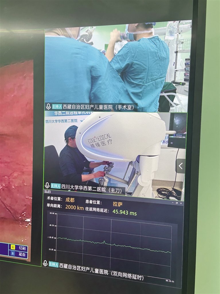 梅玲介紹,此次手術(shù)是與四川大學(xué)華西第二醫(yī)院聯(lián)合開展的,由四川大學(xué)華西第二醫(yī)院的鄭瑩教授團(tuán)隊(duì)主刀,并依托華西的先進(jìn)技術(shù)平臺(tái),通過(guò)遠(yuǎn)程方式完成手術(shù)。手術(shù)結(jié)束后,鄭瑩教授通過(guò)視頻向大家介紹,這場(chǎng)跨越2000公里距離與3000米海拔差異的手術(shù),總共用時(shí)1小時(shí)45分鐘,網(wǎng)絡(luò)延遲僅40毫秒。“此次手術(shù)的成功為今后更多優(yōu)質(zhì)資源技術(shù)送達(dá)偏遠(yuǎn)地區(qū)提供了重要參考,也為提高西藏醫(yī)療水平打下了堅(jiān)實(shí)的基礎(chǔ)。”鄭瑩說(shuō)。