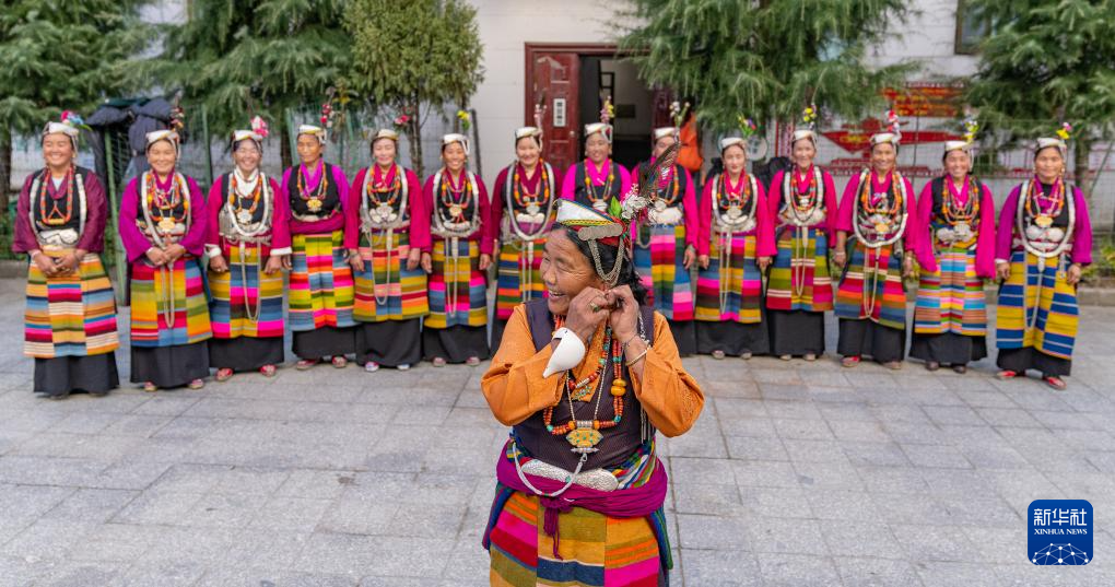 12月13日,非遺陳塘夏爾巴歌舞代表性傳承人朗嘎和夏爾巴婦女們合影。
