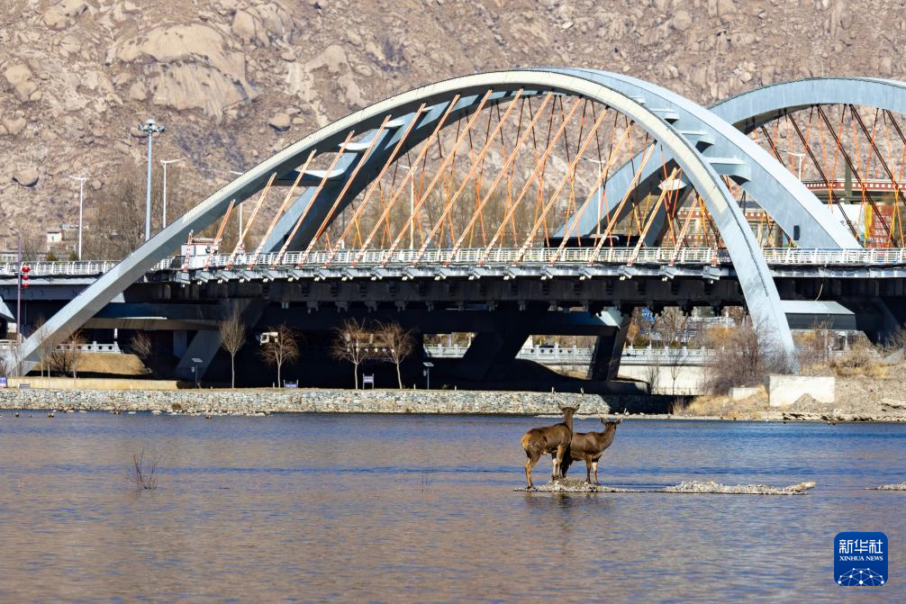 12月23日,兩只亞成體雄性白唇鹿出現(xiàn)在流經(jīng)拉薩城區(qū)的拉薩河中。新華社記者 姜帆 攝