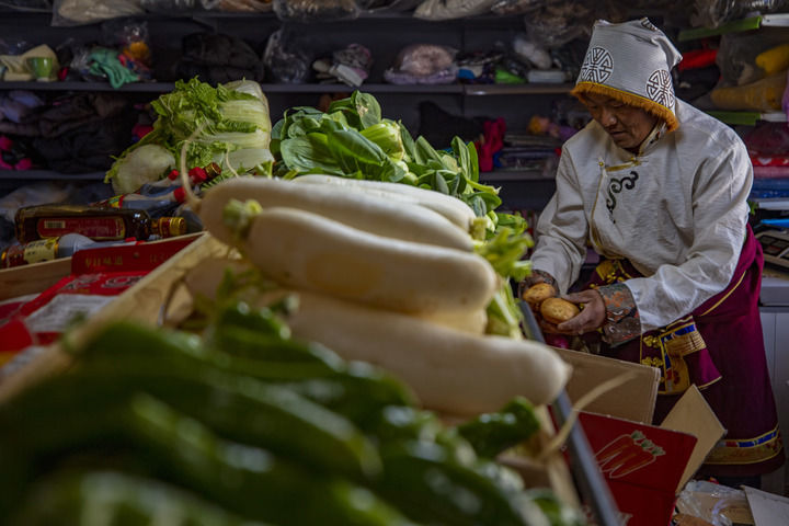 在西藏那曲市申扎縣馬躍鄉(xiāng)貝嘎四村偏遠(yuǎn)鄉(xiāng)鎮(zhèn)果蔬配送試點(diǎn)項(xiàng)目直銷點(diǎn),店主西熱加措在整理供銷合作社配送來(lái)的新鮮蔬菜(2024年1月5日攝)。新華社記者 姜帆 攝