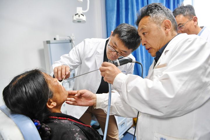 中國(guó)醫(yī)學(xué)科學(xué)院整形外科醫(yī)院王克明博士(左后)和西藏自治區(qū)人民醫(yī)院巴羅主任(右前)為患者查體(2024年8月27日攝)。新華社記者 張汝鋒 攝