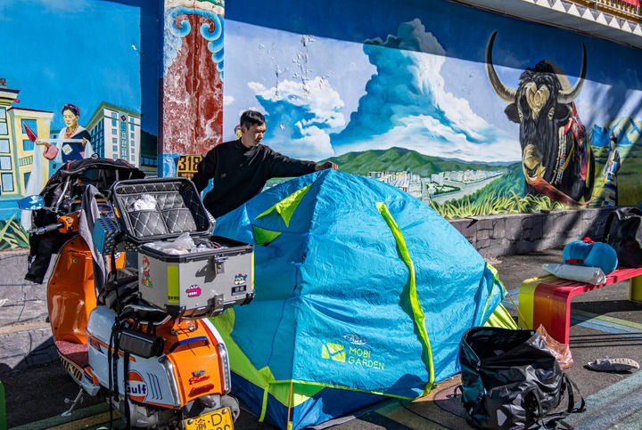 經(jīng)國(guó)道318線前往西藏旅游的重慶游客張靜在芒康縣如美鎮(zhèn)拉烏村整理帳篷(2023年10月20日攝)。新華社記者 孫非 攝
