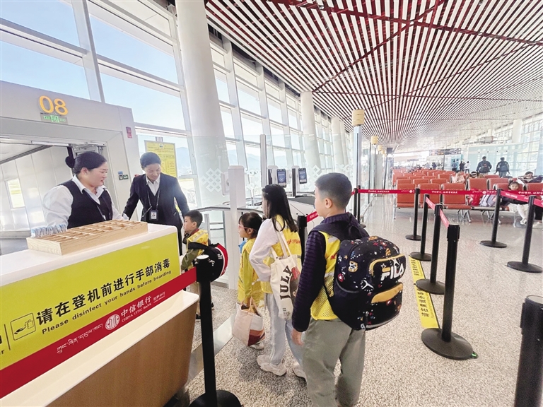 張女士表示,辦理完申請手續(xù)后,她在航班起飛前2—3小時左右到達拉薩貢嘎國際機場,在B01特殊服務(wù)柜臺(除西藏航空外)辦理了乘機手續(xù),工作人員仔細核對了小朋友的有效身份證件信息、申請書、接送機人的姓名、聯(lián)系方式、住址、行李等情況,并為無陪兒童佩戴了無陪標識掛帶和黃色馬甲。登機前,會有專人全程陪伴無陪兒童通過安全檢查、登機,最后交接給機組,由機組幫小朋友找到座位、擺放行李,完成登機流程。