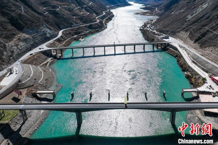 圖為12月21日,川藏交界金沙江上的數(shù)代橋梁。(無(wú)人機(jī)畫面)薛蒂 攝