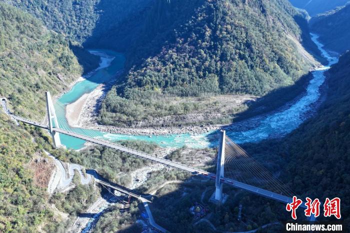 川藏公路西藏波密段昔日的“通麥天險(xiǎn)”路段如今已被大橋及隧道取代,圖為12月18日,迫龍溝特大橋與帕隆藏布江。(無(wú)人機(jī)畫面)中新社記者 趙凜松 攝