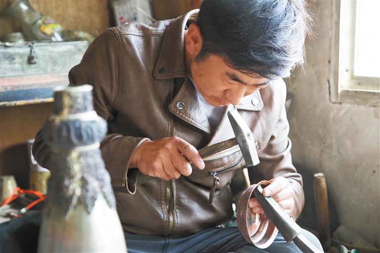 如果說唐卡繪畫是嘎瑪鄉(xiāng)的藝術(shù)名片,那么銅像鍛造無疑是其底蘊(yùn)深厚的工藝招牌。從唐卡畫院出來,沿著村中小路前行,清脆的敲銅聲如動(dòng)聽的旋律吸引著人們。走進(jìn)一家以家庭式的銅像鍛造作坊,記者見到了正在忙碌的銅像鍛造師丁巴曲培。