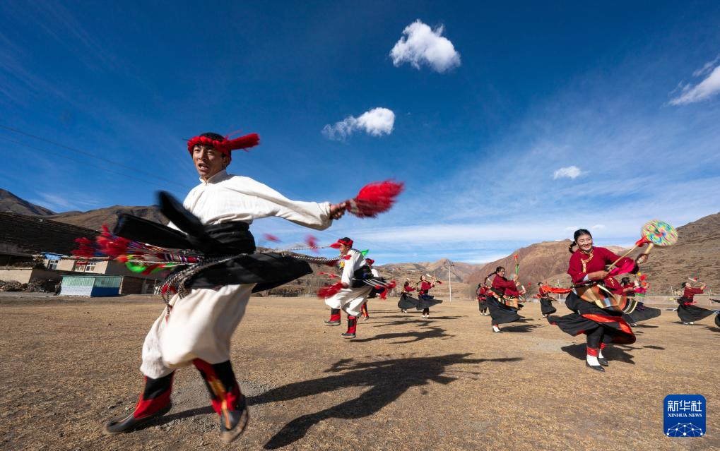 西藏昌都市丁青縣尺犢鎮(zhèn)烏巴村文藝演出隊在跳熱巴舞(1月5日攝)。新華社記者 丁增尼達 攝