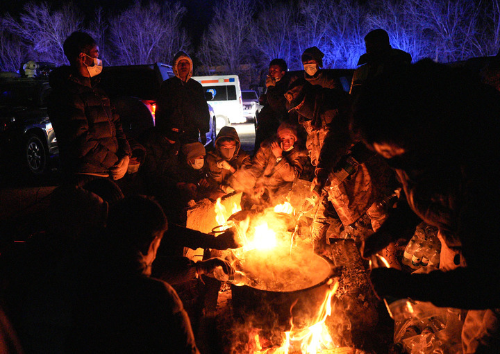 1月7日晚,安置點的受災群眾在煮水準備泡方便面。新華社記者 晉美多吉 攝