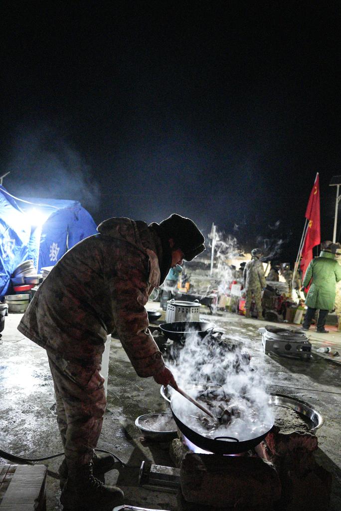 1月7日,在定日縣古榮村集中安置點,解放軍為受災群眾做飯。