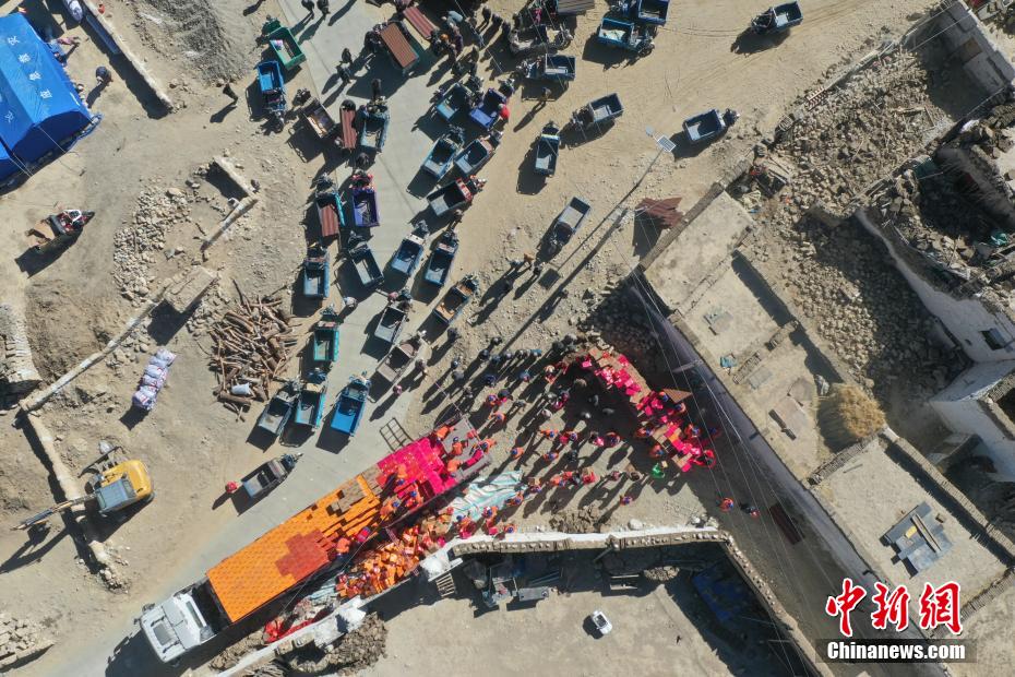 1月9日,西藏自治區(qū)定日縣曲洛鄉(xiāng)措昂村安置點(diǎn),愛(ài)心企業(yè)為受災(zāi)民眾發(fā)放生活物資。當(dāng)日,位于西藏自治區(qū)定日縣曲洛鄉(xiāng)措昂村安置點(diǎn),西藏各級(jí)救援人員和愛(ài)心企業(yè)不斷轉(zhuǎn)運(yùn)、發(fā)放生活物資、搭建活動(dòng)板房、全力保障受災(zāi)民眾的飲食供應(yīng)等,保障受災(zāi)民眾基本生活。(無(wú)人機(jī)照片)中新社記者 貢嘎來(lái)松 攝