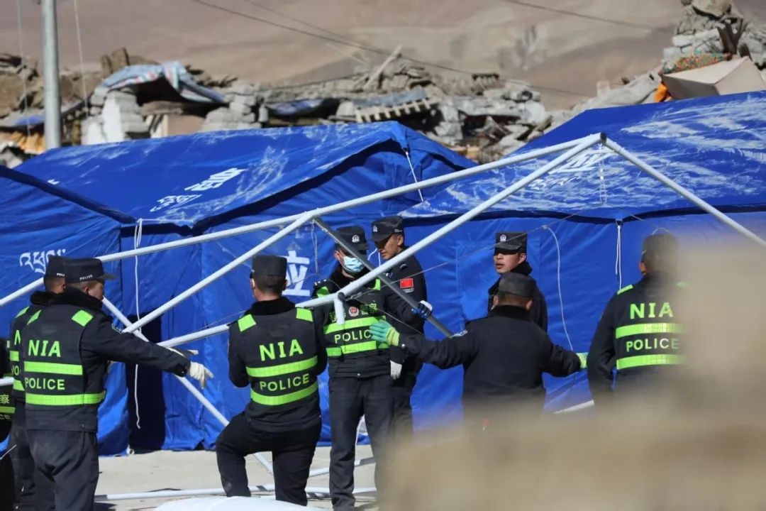 圖為日喀則邊境管理支隊民警在定日縣長所鄉(xiāng)玉白村安置點為群眾搭建帳篷。郭遠敬 攝