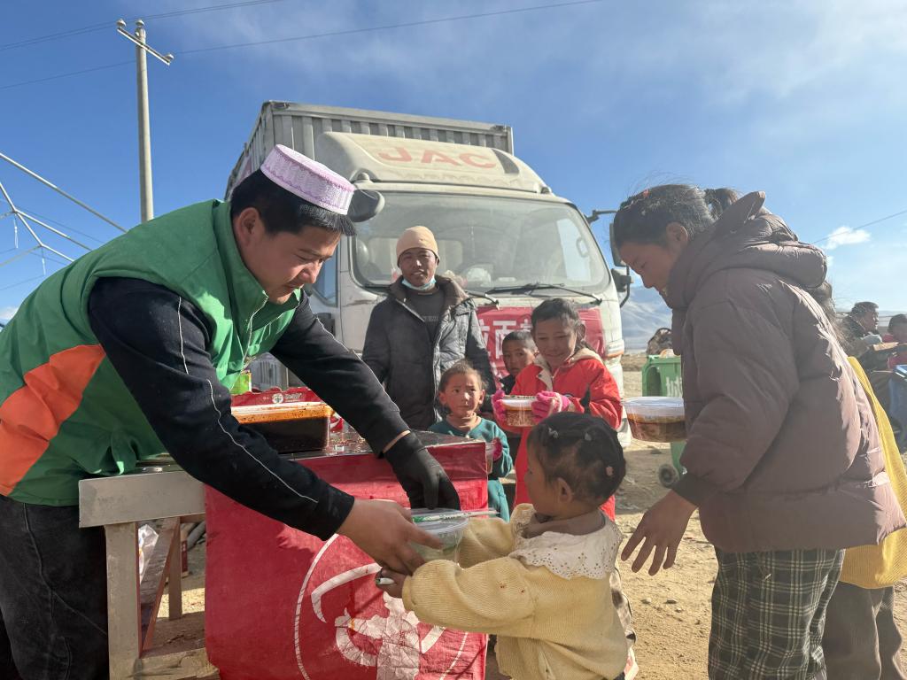 西藏定日6.8級地震發(fā)生后第二天,看到地震的消息,馬杰和朋友立馬帶上物資奔赴災區(qū)救援一線。一行5人從甘肅臨夏出發(fā),驅車2700多公里,10日到震中后便開始給受災群眾免費做拉面。