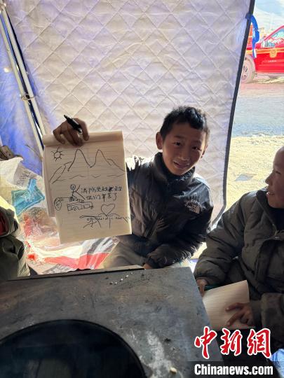 多吉擔(dān)心地震給孩子們帶來心理陰影,為了讓他們樂觀度過這段時(shí)間,多吉整理了單位用來存放物資的帳篷作為畫畫的地方,又特意托加油站工作人員為孩子們購買了彩筆和畫本。