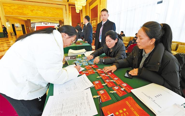 圖為1月16日,參加自治區(qū)十二屆人大三次會(huì)議的人大代表向大會(huì)報(bào)到。記者 唐斌 洛桑 攝