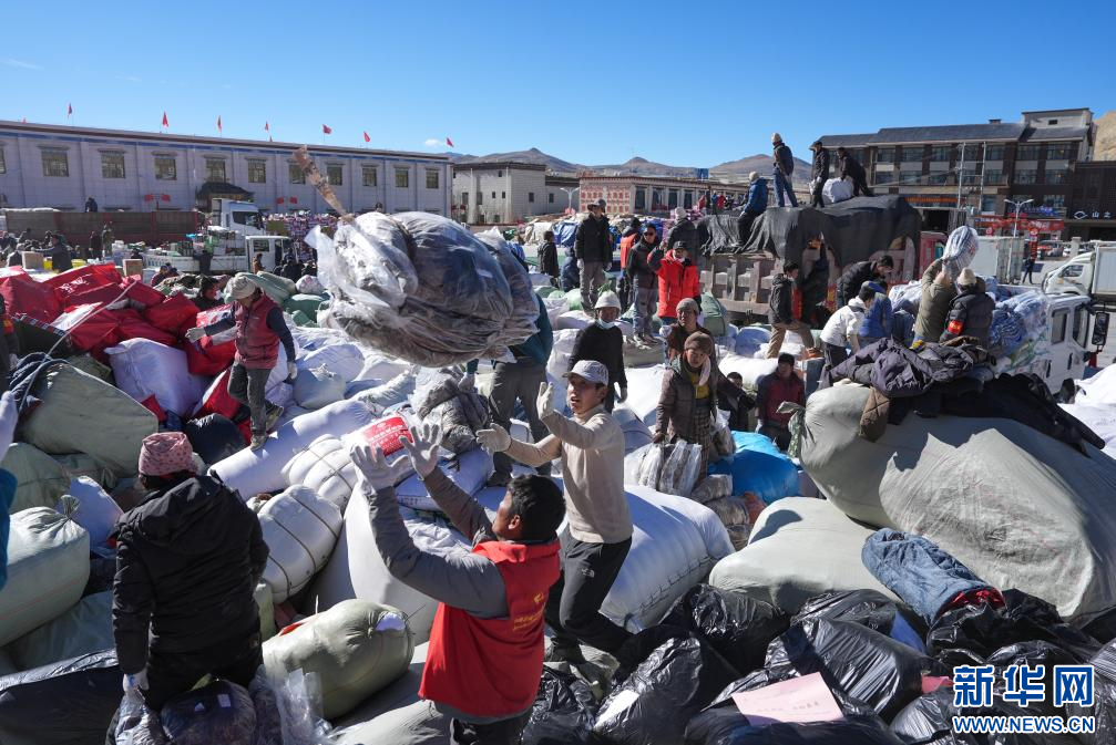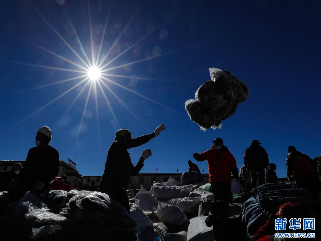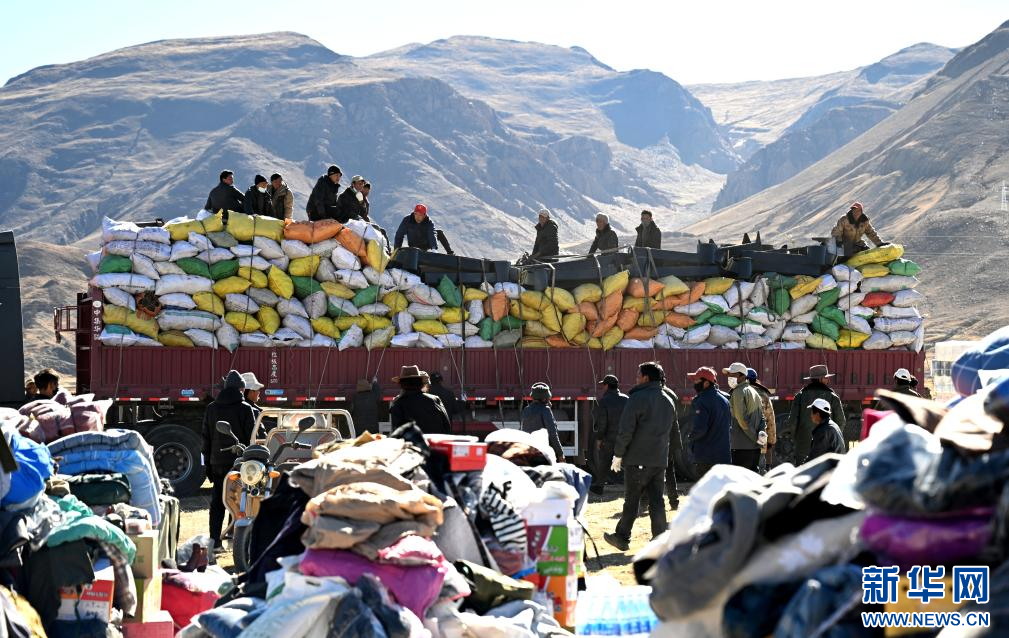 1月10日,在定日縣民族團(tuán)結(jié)廣場(chǎng),人們搬運(yùn)將要運(yùn)往受災(zāi)群眾安置點(diǎn)的過冬物資。新華社記者 沈伯韓 攝
