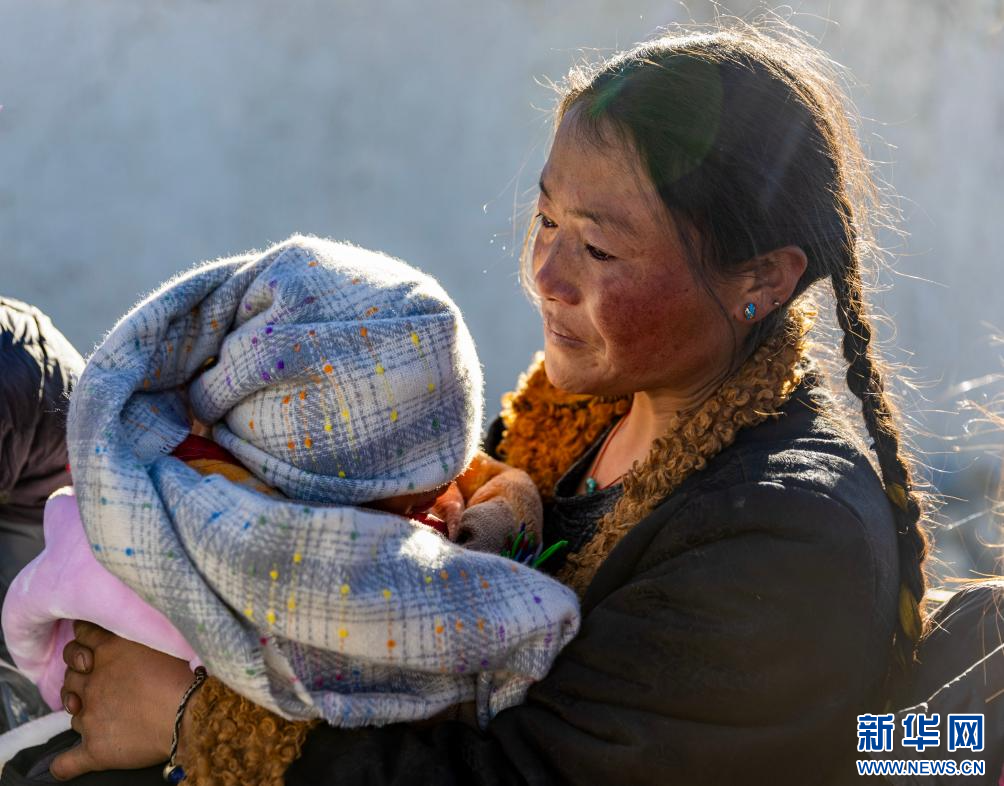 1月8日,定日縣長(zhǎng)所鄉(xiāng)通來村的受災(zāi)群眾措姆抱著自己的孩子在領(lǐng)取志愿者送來的御寒衣物。新華社記者 姜帆 攝