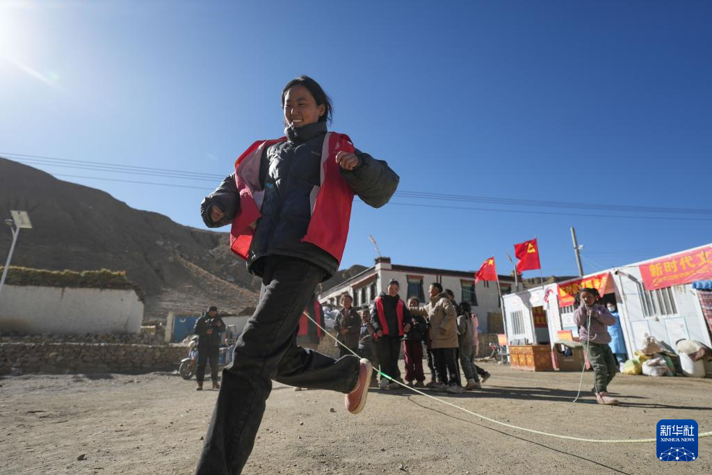 1月25日,在定日縣曲洛鄉(xiāng)熱木青村安置點,大學生志愿者在安置點和孩子們一起玩游戲。新華社記者 晉美多吉 攝