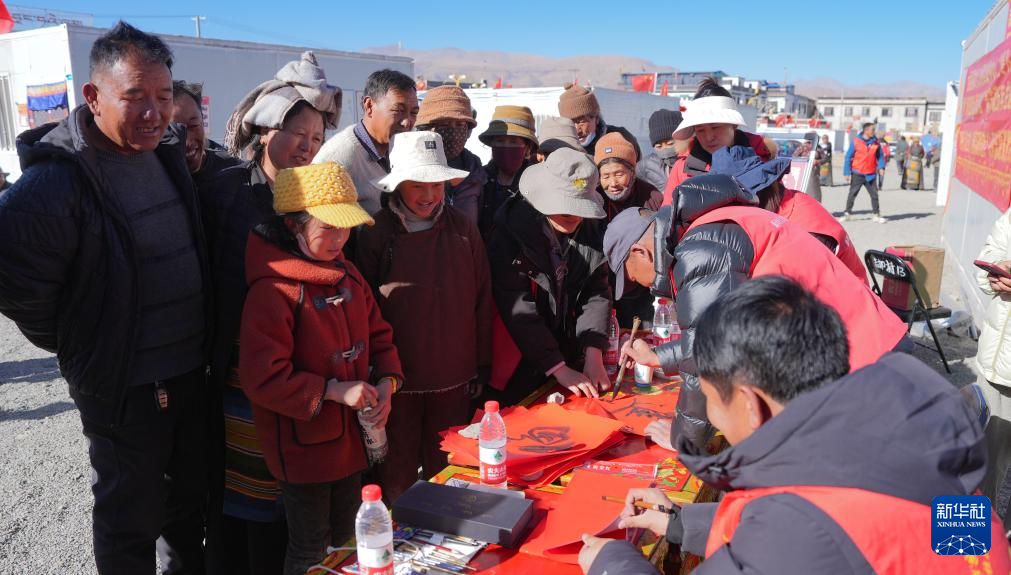 1月26日,書法家協(xié)會的志愿者在拉孜縣吉如村安置點為受災群眾書寫春聯(lián)。新華社記者 晉美多吉 攝