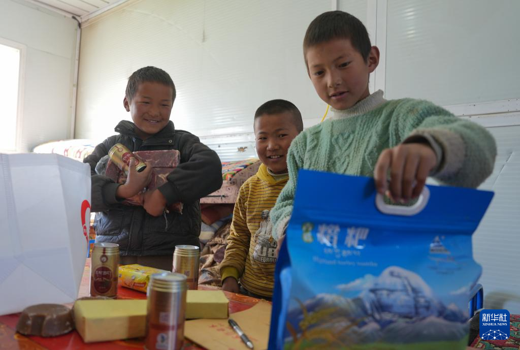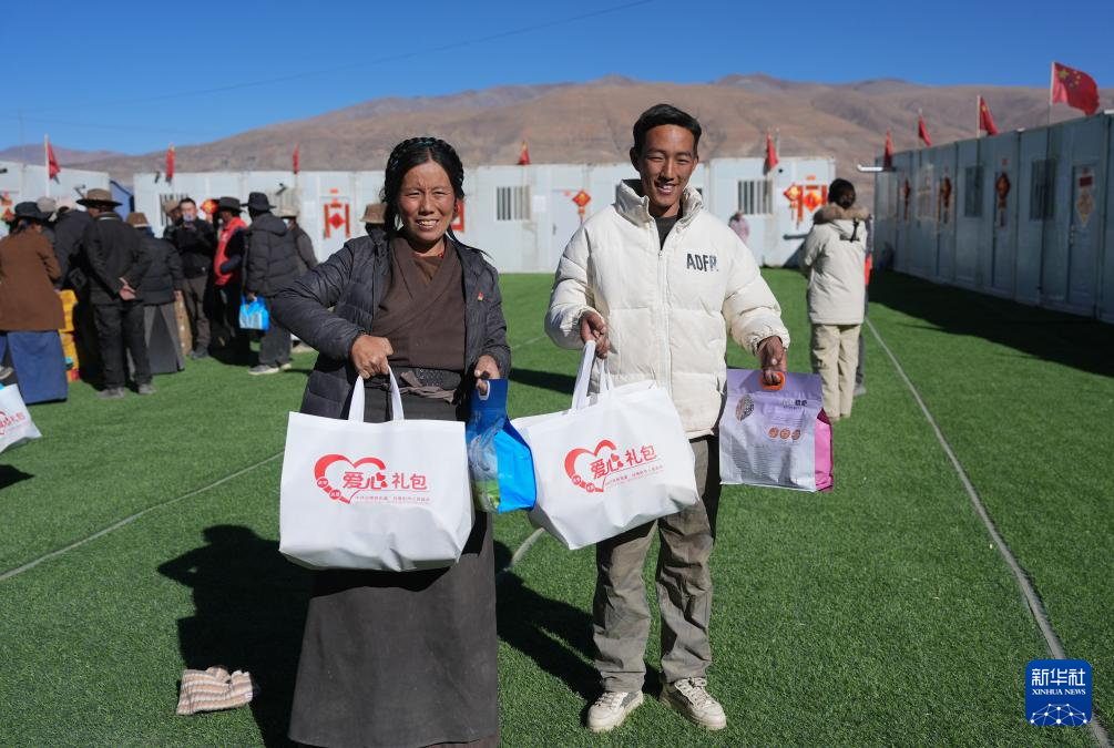 1月27日,拉孜縣加嘎村安置點受災群眾領(lǐng)到新年大禮包。新華社記者 晉美多吉 攝