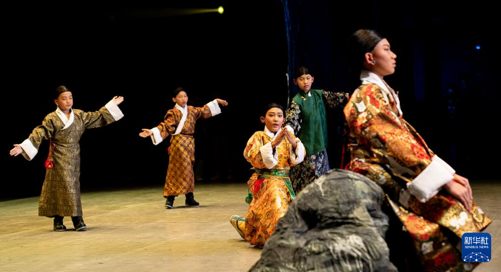 這是西藏首部少兒舞臺(tái)劇藏戲《頓月頓珠》演出現(xiàn)場(chǎng),羅桑朗覺(jué)(右三)在劇中飾演“頓月”(2月11日攝)。新華社記者 丁增尼達(dá) 攝