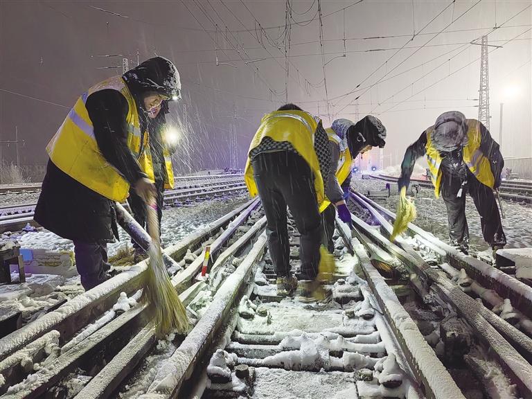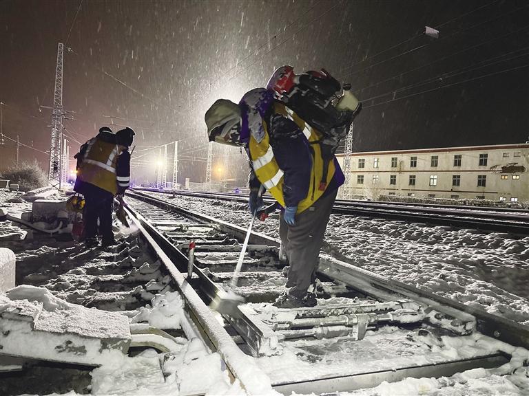 “掃雪時要注意腳下,防止滑倒……”到達拉薩西貨場1號道岔后,工長白登渠影帶領(lǐng)職工們按照分工,有序地使用掃把、除雪鏟、除雪鉤、吹雪機等工具,對道岔尖軌、滑床板、轉(zhuǎn)轍部位等關(guān)鍵位置的積雪進行清理。在紛紛揚揚的大雪中,大家踩雪發(fā)出的“嘎吱”聲、雪鏟除冰的敲擊聲交織在一起。