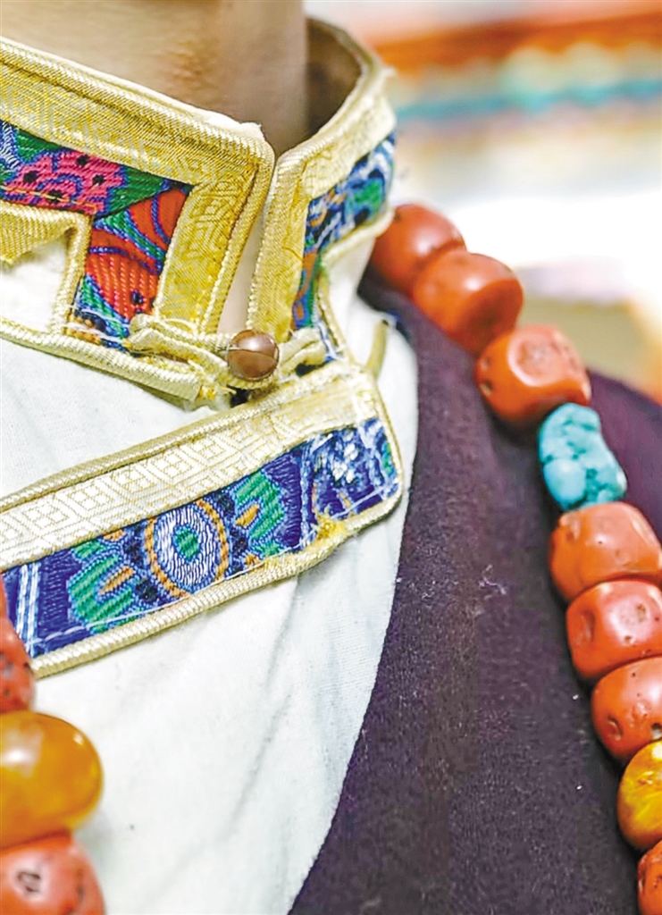 男士們大多身著用家織氆氌制作的藏袍,以黑、白色為主,領(lǐng)口、袖口、下擺等位置鑲嵌著精美的“十”字紋花邊。他們頭戴金花帽,腳穿“松巴”鞋,整個(gè)裝扮既展現(xiàn)了高原男子的粗獷與豪放,又透露出一種對(duì)細(xì)節(jié)的極致追求。女士們的服飾則更加豐富多彩,她們穿著黑色氆氌藏袍,內(nèi)搭彩色襯衫,系著彩虹條紋的“邦典”,已婚女子還會(huì)將各色絲線編入頭發(fā)中形成發(fā)辮,恰似高原上綻放的花朵。