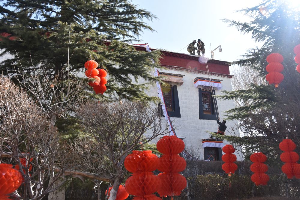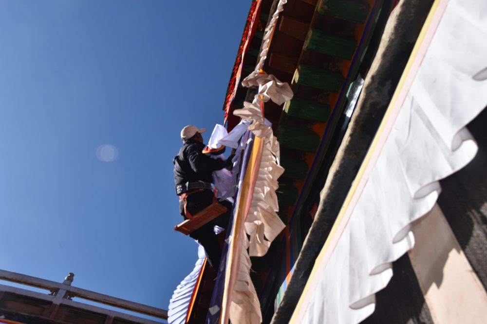 “布達(dá)拉宮門窗眾多,需要更換總長近1萬米的‘香布’及數(shù)百個(gè)門簾、窗簾等?!辈歼_(dá)拉宮管理處維修科科長扎西平措介紹,為確保在藏歷新年前完成所有工作,管理處根據(jù)往年慣例提前10天左右開始更換作業(yè)。