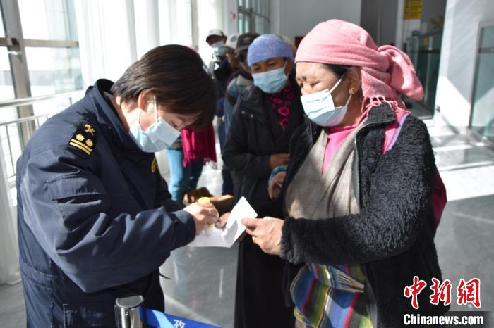 圖為日喀則海關里孜口岸女關員協助入境邊民粘貼入境識別碼。拉薩海關供圖